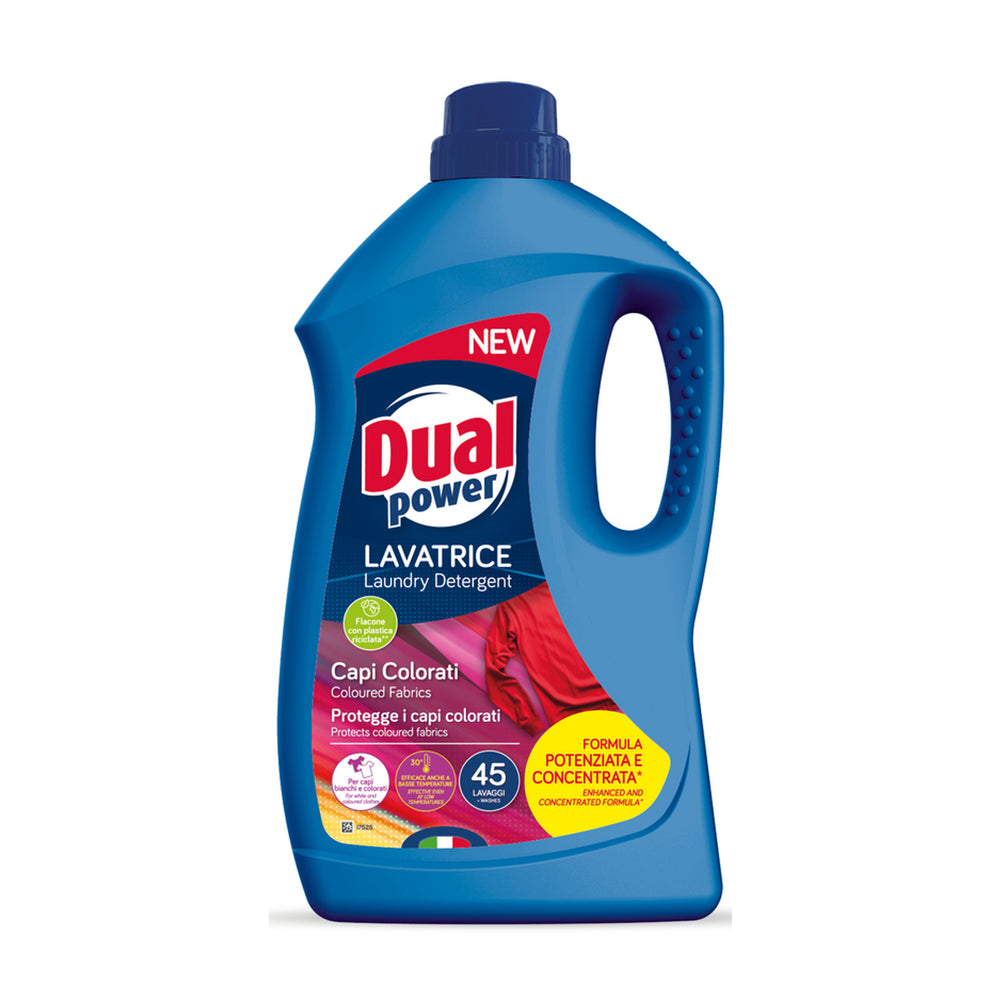 Dual Power Lavatrice Capi Colorati è un detersivo liquido pensato per lavare i capi colorati in modo efficace ma delicato, aiutando a preservare la brillantezza dei colori e a evitare l’effetto “sbiadito” lavaggio dopo lavaggio. Perfetto per t-shirt, felpe, pantaloni casual, intimo e abbigliamento quotidiano dalle tinte vive.
