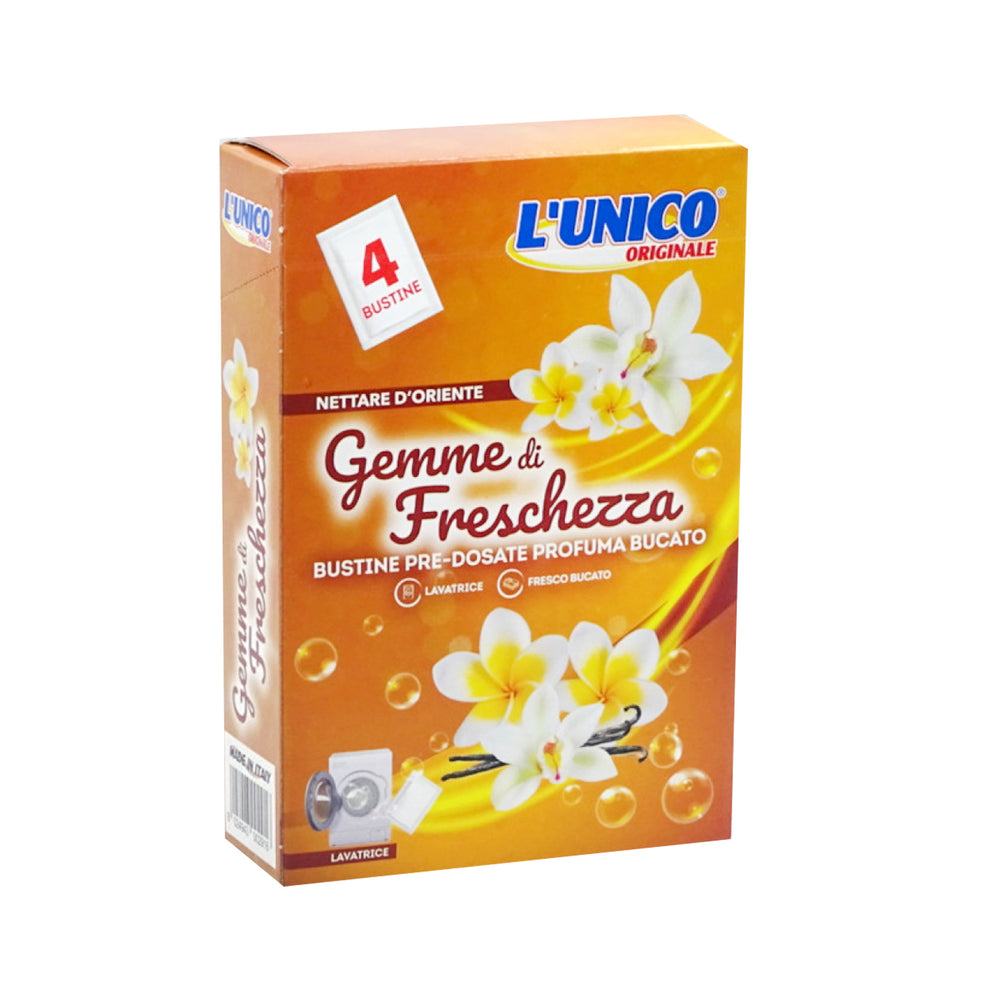 Perle profuma-bucato a lunga durata con note orientali calde e avvolgenti: intensificano e prolungano il profumo dei capi in lavatrice, lasciandoli eleganti e piacevolmente profumati per giorni.