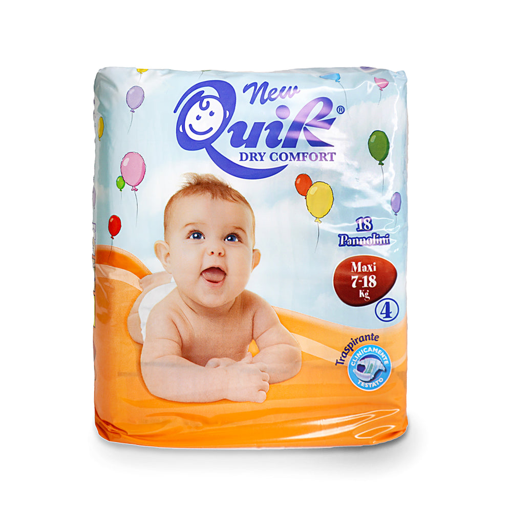 I Quik Pannolini Maxi taglia 4 sono pensati per bambini da 7 a 18 kg, offrendo protezione, comfort e libertà di movimento sia di giorno che di notte. La chiusura in velcro riposizionabile e gli elastici laterali garantiscono una vestibilità sicura, mentre il corpo centrale assorbe rapidamente.
