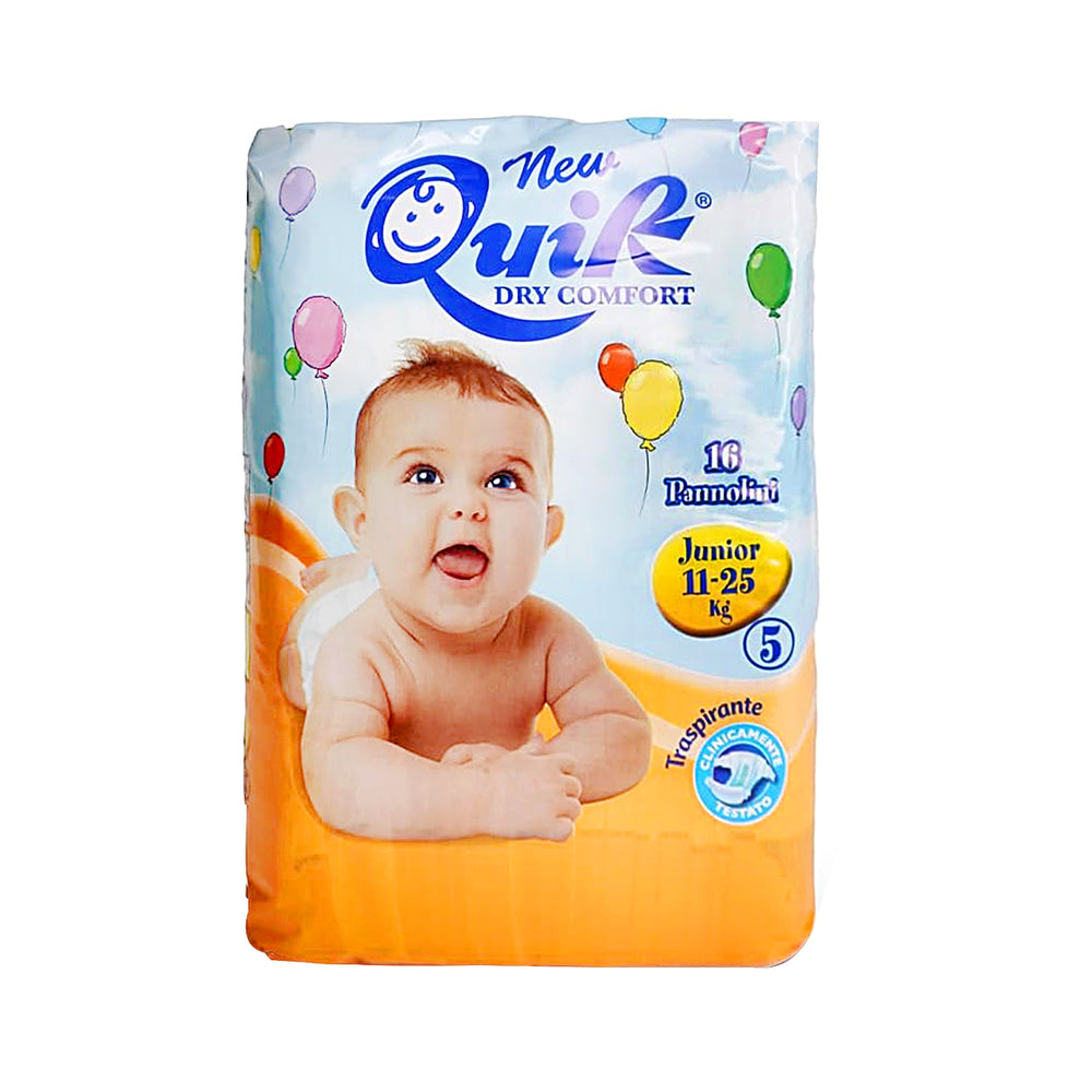 I Quik Pannolini Junior Taglia 5 sono progettati per bambini di peso compreso tra 11 e 25 kg, offrendo comfort superiore, assorbenza elevata e protezione durante tutta la notte. La combinazione di materiali morbidi e barriere protettive garantisce vestibilità sicura e pelle asciutta.