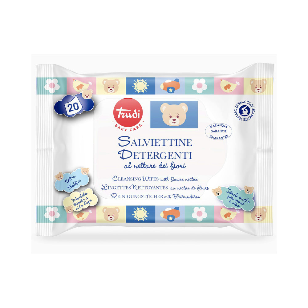 Le Trudi Baby Care Salviettine “Nettare dei Fiori” 20 pezzi offrono una detersione delicata per viso, mani e sederino del bambino. Con il tessuto a nido d’ape ultra soffice e l’emulsione fluida al nettare dei fiori, lasciano la pelle morbida, nutrita e perfettamente pulita.