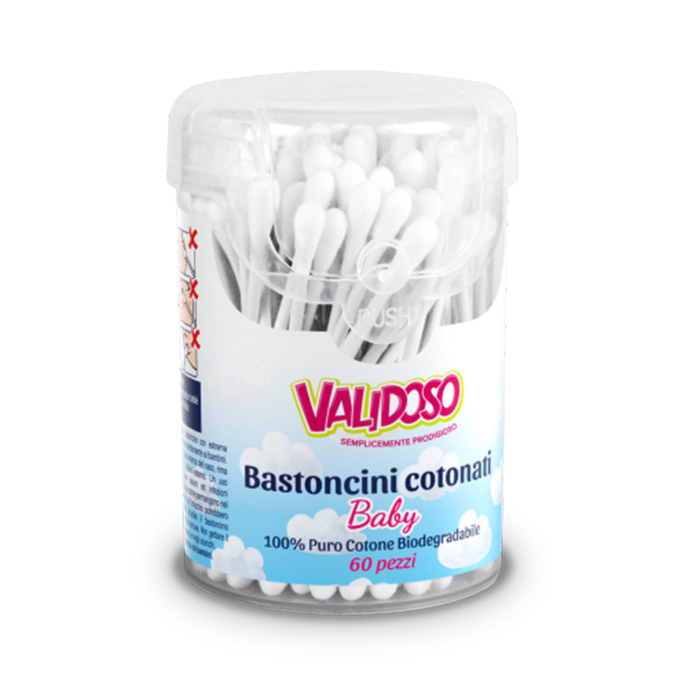 I Validoso Bastoncini Cotonati Baby sono progettati per garantire un'igiene delicata e sicura per i più piccoli. Realizzati con 100% puro cotone, offrono una morbidezza ideale per la cura quotidiana del tuo bambino. La confezione da 60 pezzi è pratica e richiudibile, assicurando igiene e comodità d'uso.